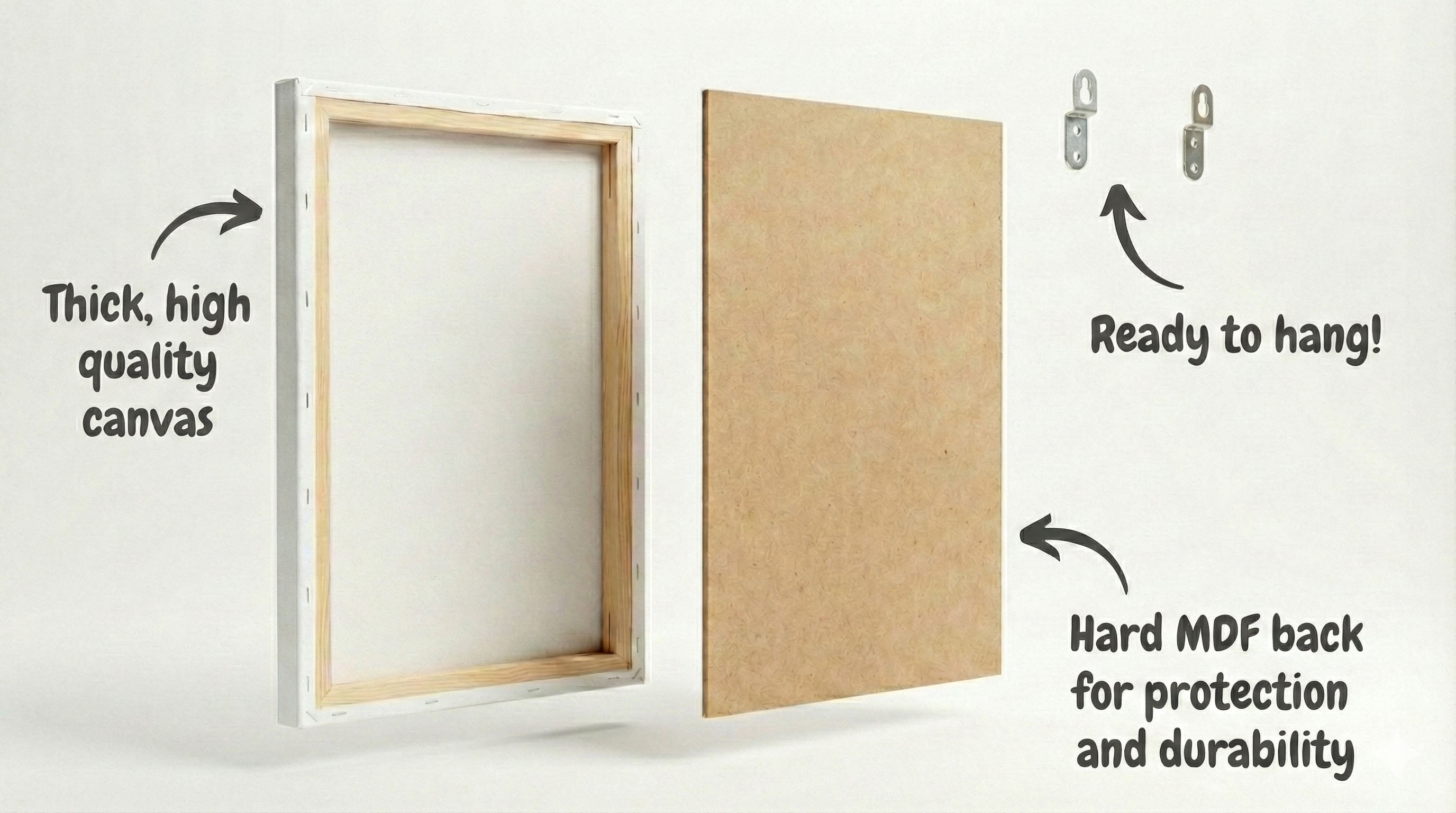 Our canvases are printed with fade-resistant inks on thick canvas made with premium cotton blend, ensuring vibrant colors and longevity. Each piece is hand-wrapped for a gallery-grade finish.